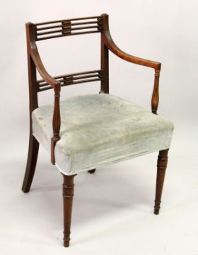 A GEORGE III MAHOGANY CARVER/DESK CHAIR, with two rows of pierced bars, reeded arms, overstuffed feet on turned, tapering legs.