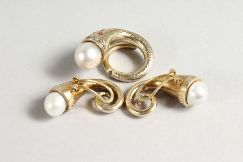 A PAIR OF TRUMPET SHAPED PEARL EARRINGS AND RING.