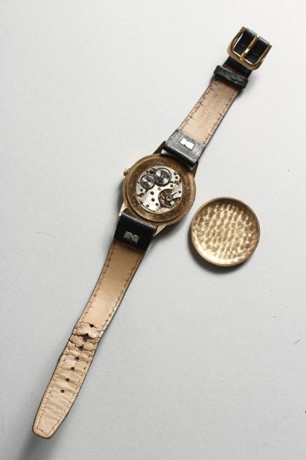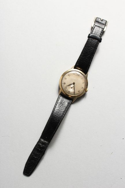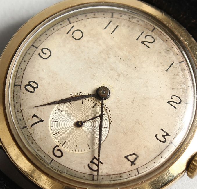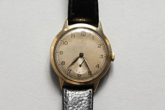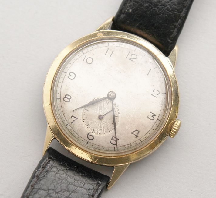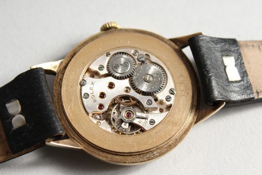 AN EARLY 9CT GOLD DENNISON CASE ROLEX WRISTWATCH, No. 13874, with leather strap.