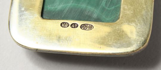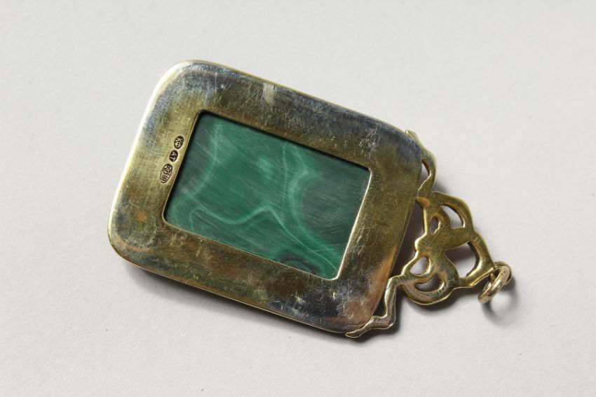 A GOOD MODERN RUSSIAN SILVER, ENAMEL AND MALACHITE PENDANT.
