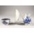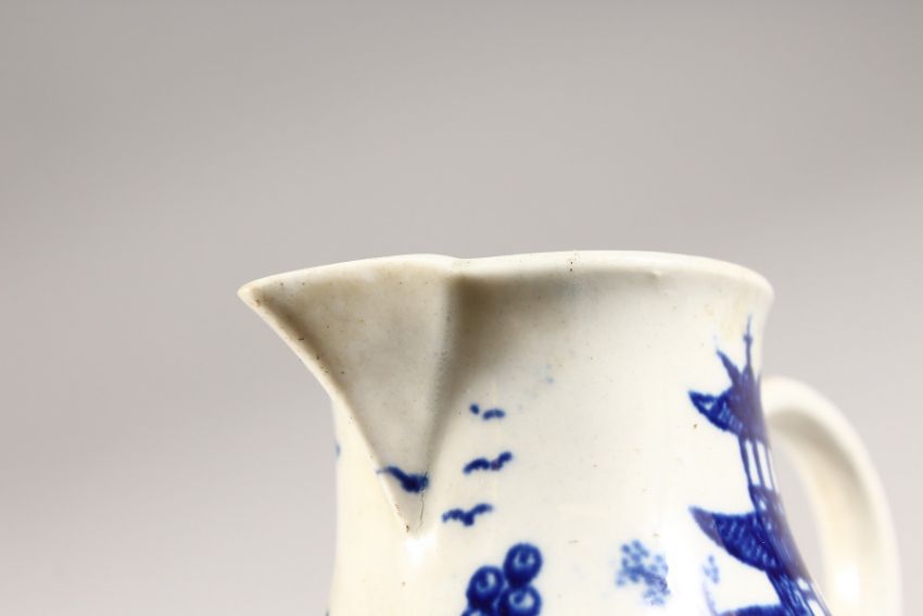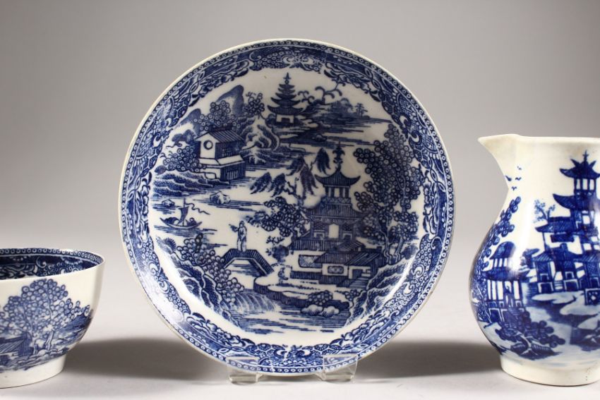 A WILLOW PATTERN BLUE AND WHITE TEA BOWL AND SAUCER, unusual mark, and A SPARROW BEAK JUG. (3)