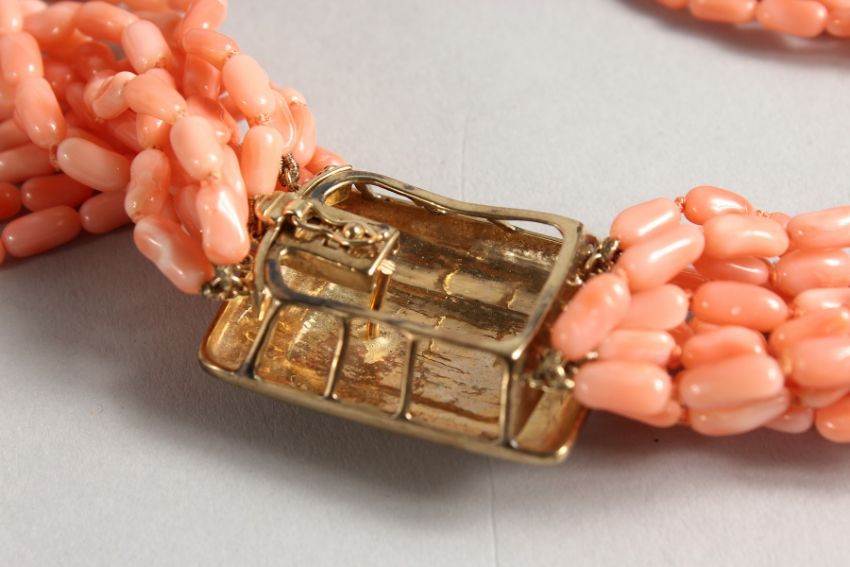 A TWELVE STRAND CORAL AND BEAD NECKLACE with 14ct gold clasp.