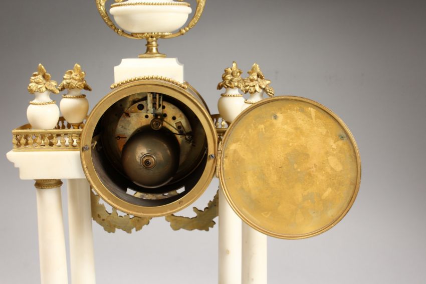 A VERY GOOD LOUIS XVI WHITE MARBLE AND ORMOLU DRUM SHAPED MANTLE CLOCK, with 4.5ins enamel dial, eight day movement and pillar support.