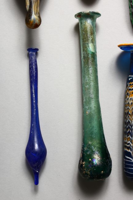 A COLLECTION OF TWELVE ROMAN/EGYPTIAN-STYLE DECORATIVE GLASS PIECES.