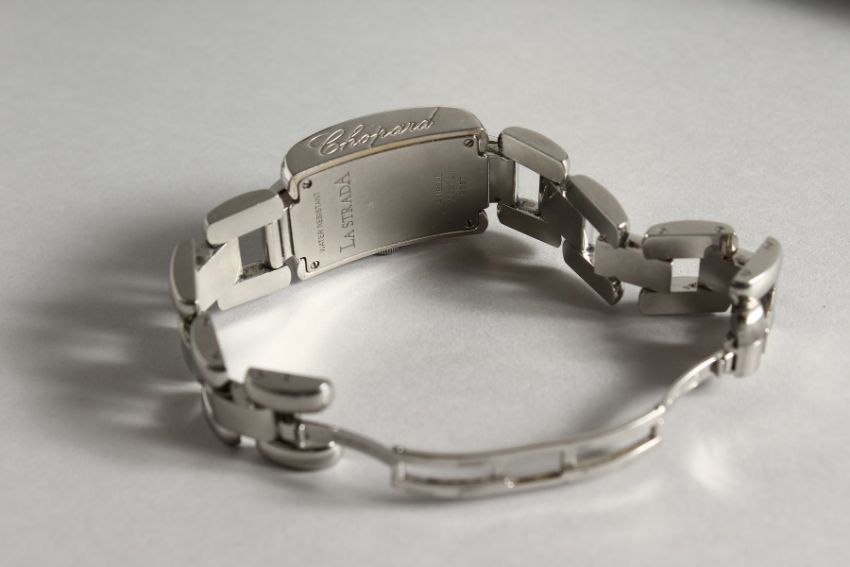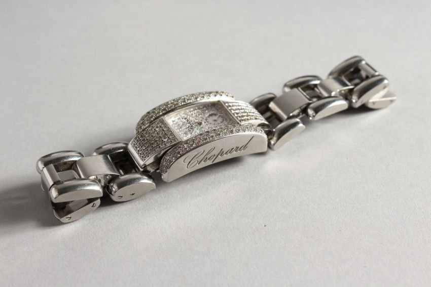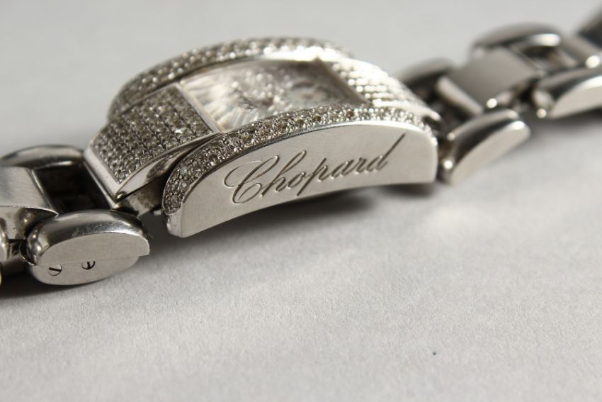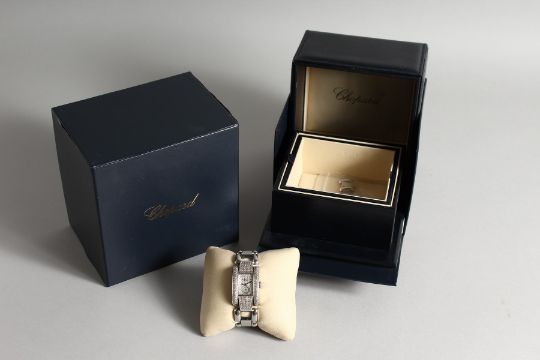 A VERY GOOD LADIES DIAMOND SET CHOPARD "LA STRADA" WRISTWATCH, No. 41/8380 1093723 8357, with spare link in original box.