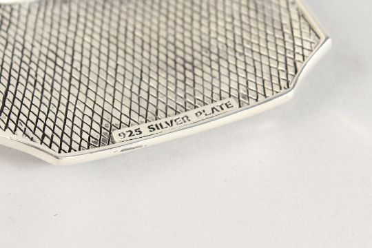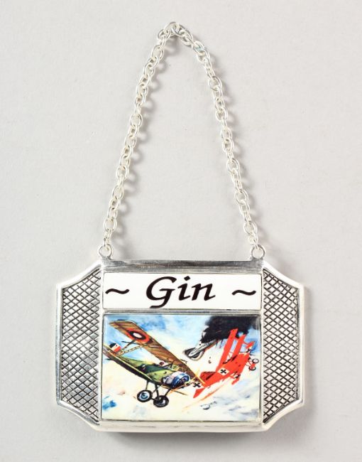 A SILVER PLATED DECANTER LABEL "GIN", enamel decorated with an aeronautical dog fight including "The Red Baron" Manfred von Richthofen in his Fokker tri-plane.