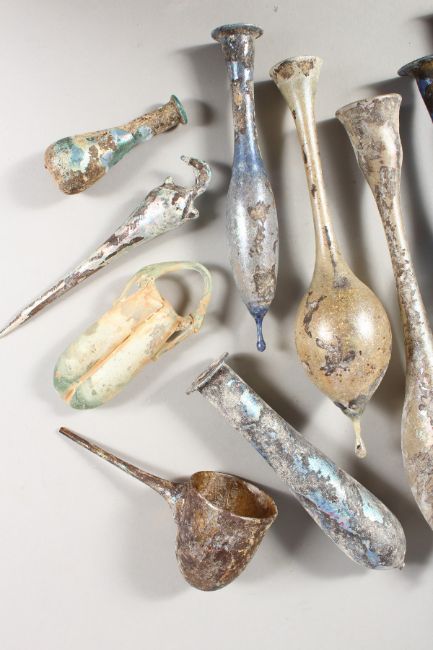 A COLLECTION OF FIFTEEN ROMAN-TYPE DECORATIVE GLASS VESSELS.