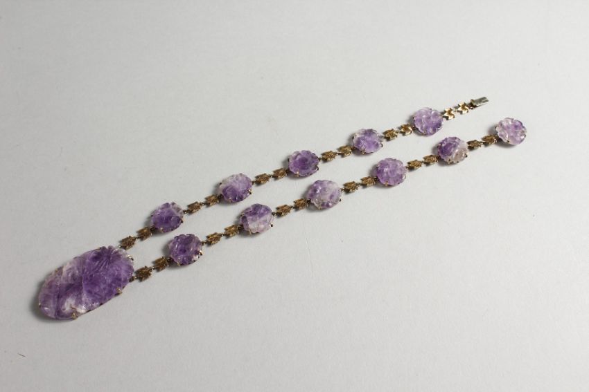A 14CT GOLD AND AMETHYST NECKLACE.