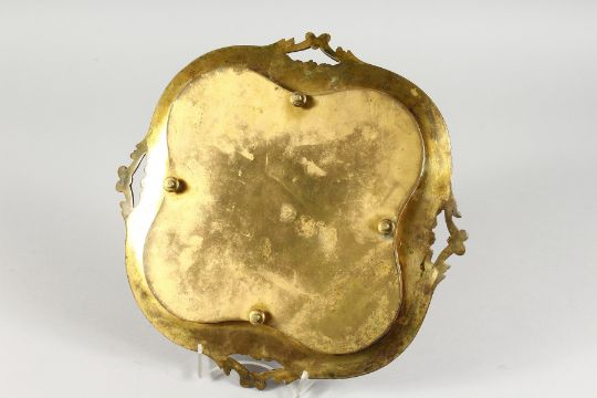 A SUPERB 19TH CENTURY FRENCH CHAMPLEVE ENAMEL AND PORCELAIN PLATTER, the centre with a porcelain panel painted with figures in a boat and swans, in a good champleve enamel frame.