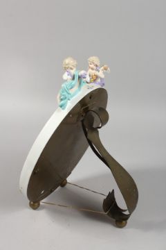 A GOOD 19TH CENTURY MEISSEN OVAL MIRROR with cupid holding a garland.