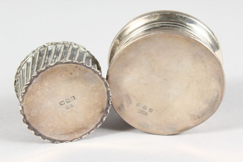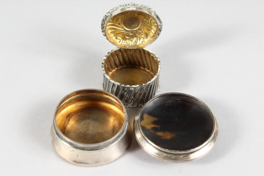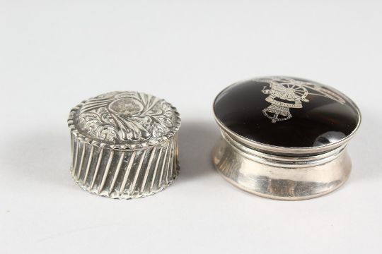 A SILVER AND TORTOISESHELL PILL BOX with ROYAL ARTILLERY CREST AND MOTTO, 1.75ins diameter, Birmingham 1916, and A CIRCULAR RIBBED PILL BOX, Birmingham 1892.
