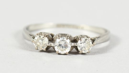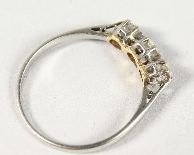AN 18CT GOLD THREE STONE DIAMOND RING.