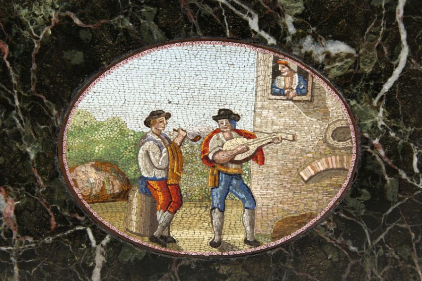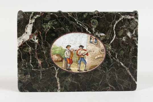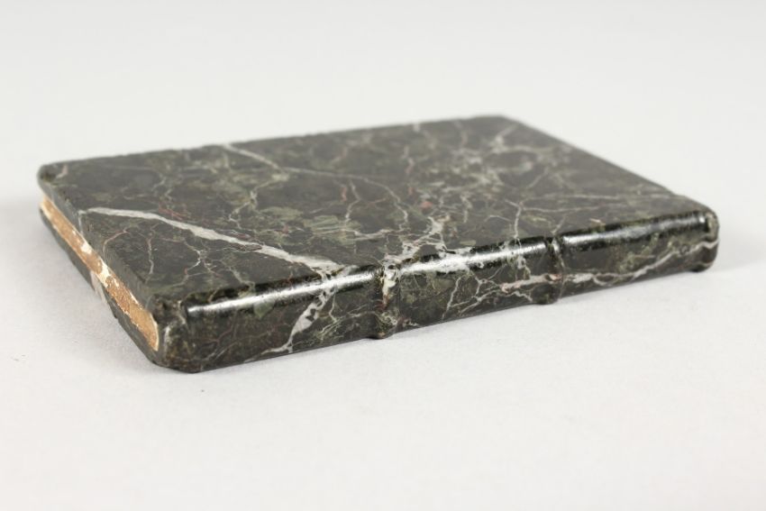 A 19TH CENTURY ITALIAN MARBLE BOOK SHAPED WEIGHT with oval micromosaic "THE BAKERS".