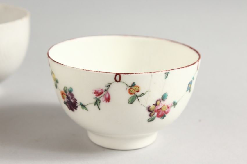 AN 18TH CENTURY CHELSEA DERBY AND LATER THREE TEA BOWLS, two cups and two saucers. (AF)
