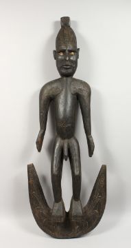 A LARGE CARVED WOOD STANDING MALE FIGURE.