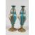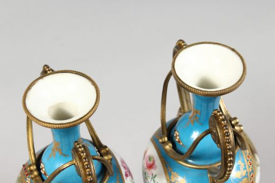 A GOOD PAIR OF 19TH CENTURY SEVRES PORCELAIN AND ORMOLU TWO HANDLED VASES, pale blue ground painted with reverse oval panels of flowers and classical figures, held within an ormolu frame.