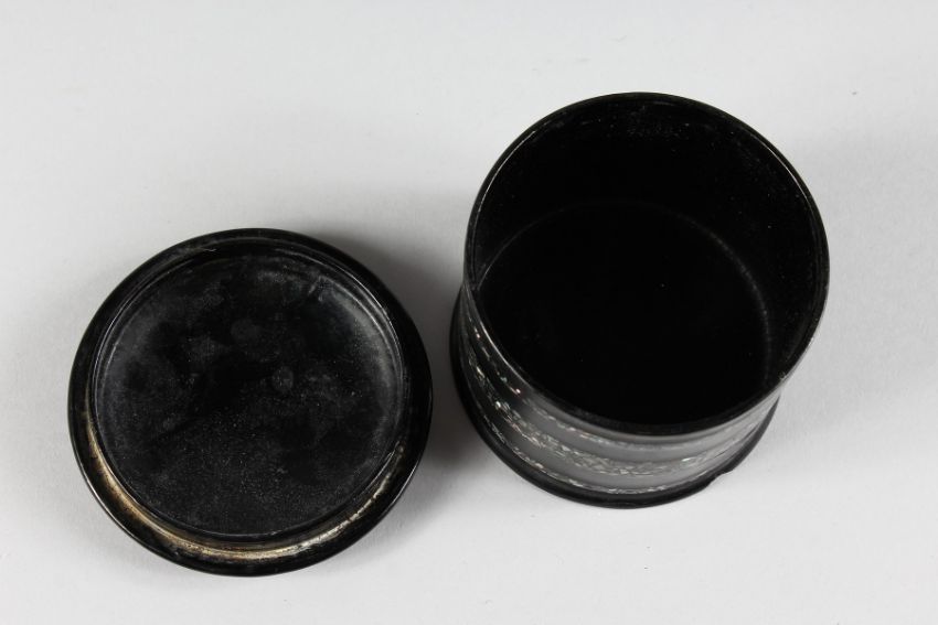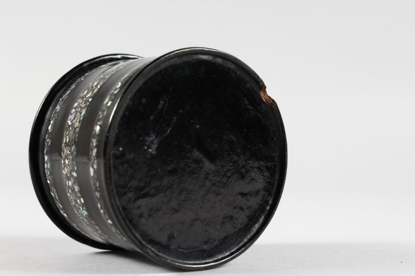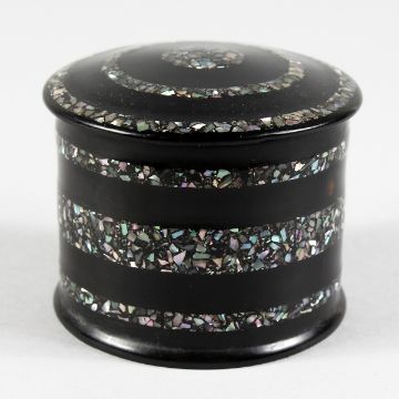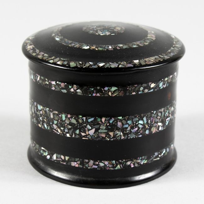 A PAPIER MACHE AND MOTHER-OF-PEARL CIRCULAR BOX AND COVER.