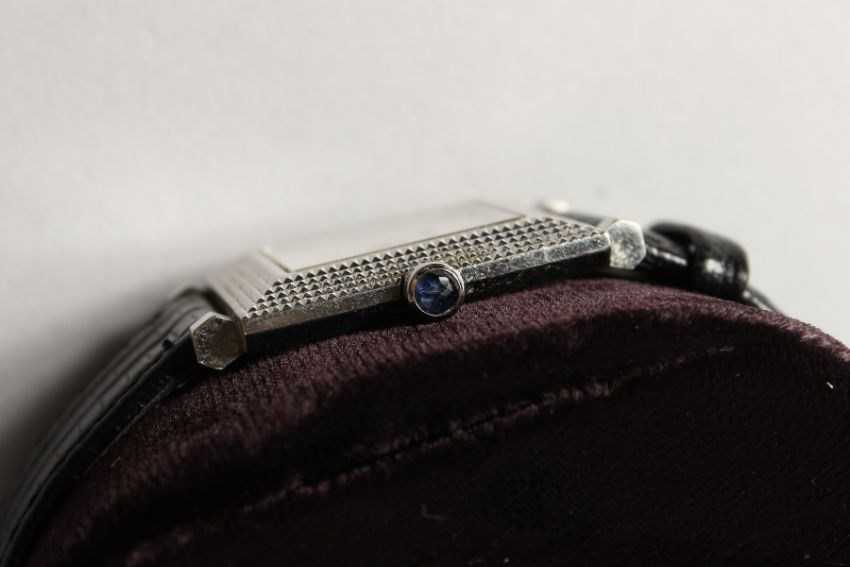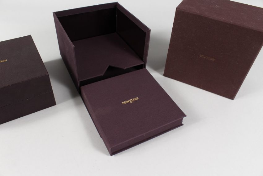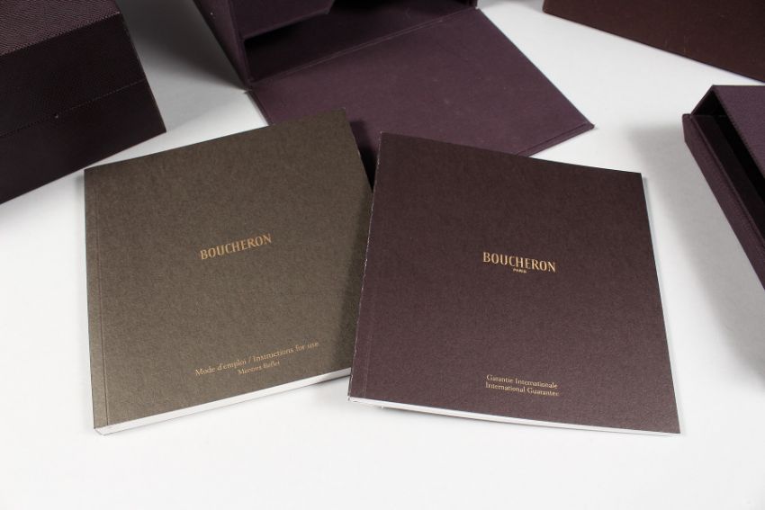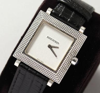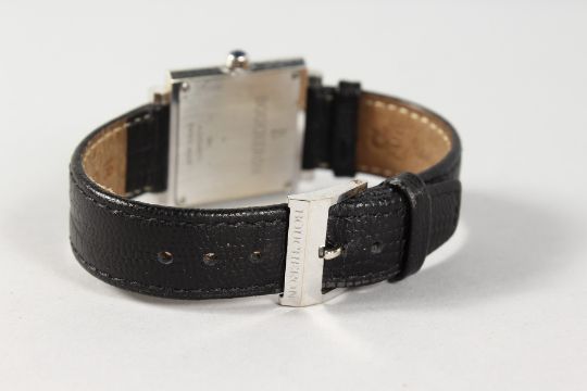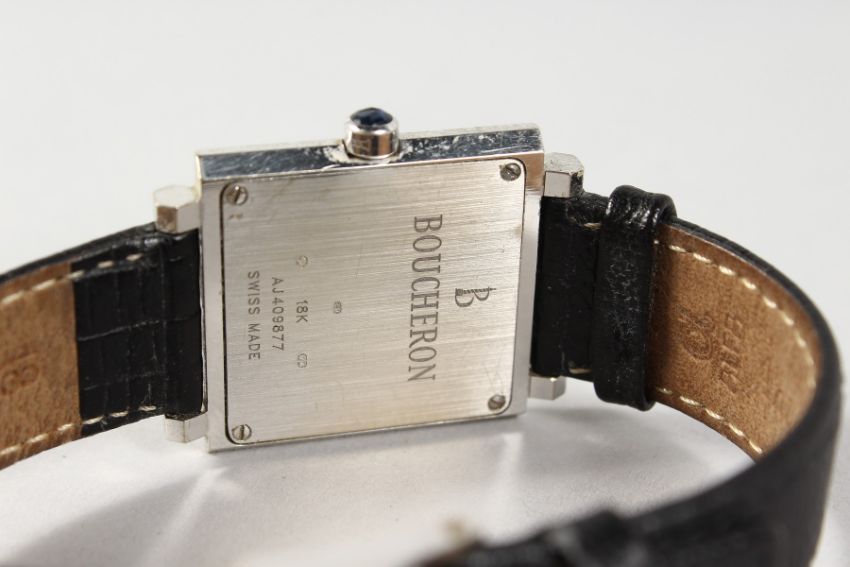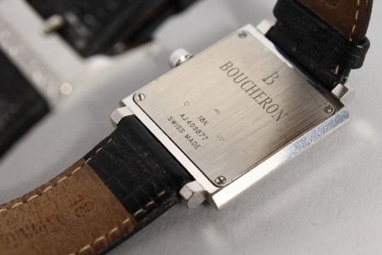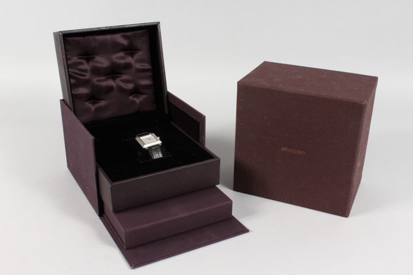 A VERY GOOD BOUCHERON 18K GOLD WRISTWATCH with leather strap, No. AJ409877, in a Boucheron box and board cover.