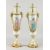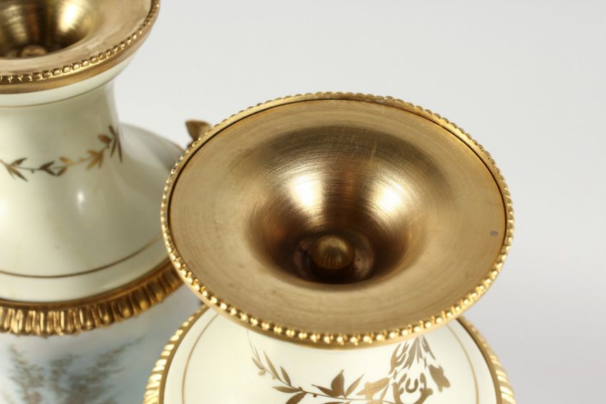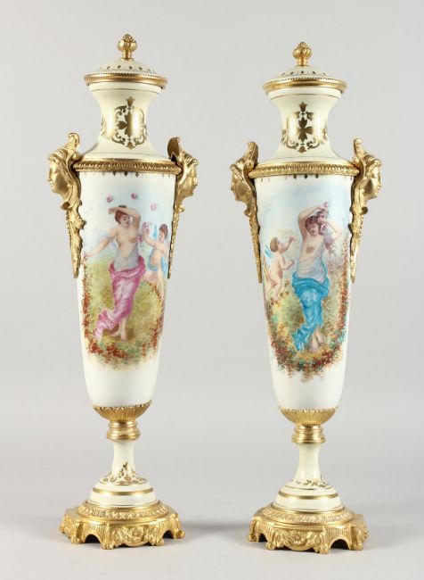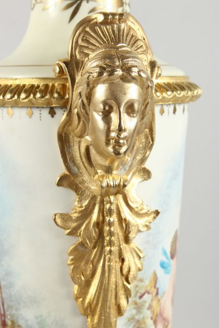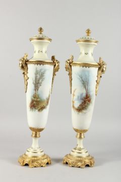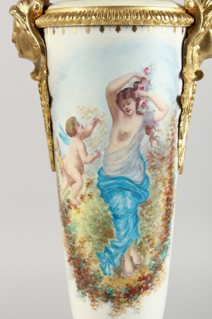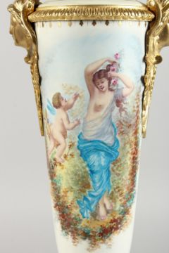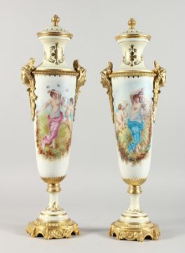 A PAIR OF TALL, SLENDER SEVRES STYLE PORCELAIN VASES with ormolu mounts.