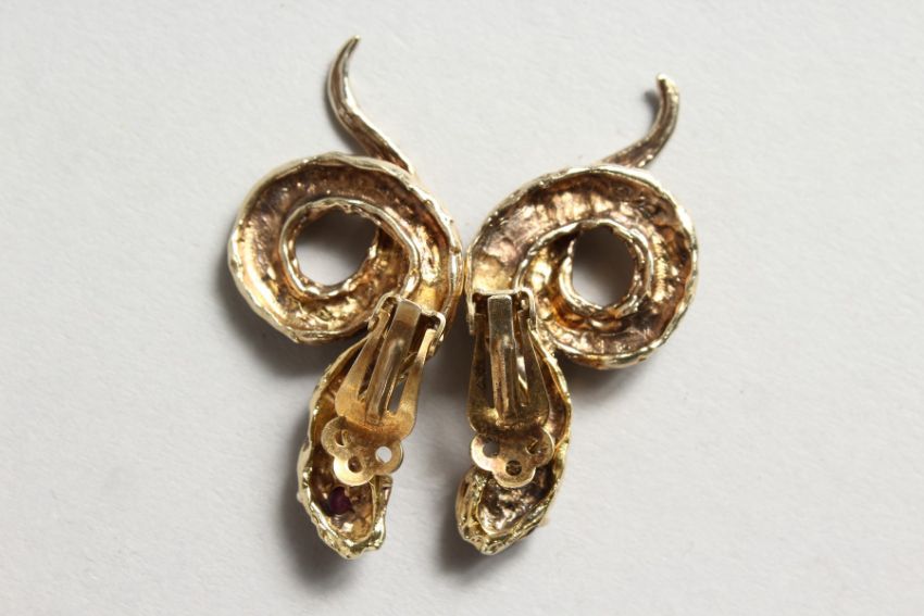 A PAIR OF SNAKE SHAPED EARRINGS AND RINGS.