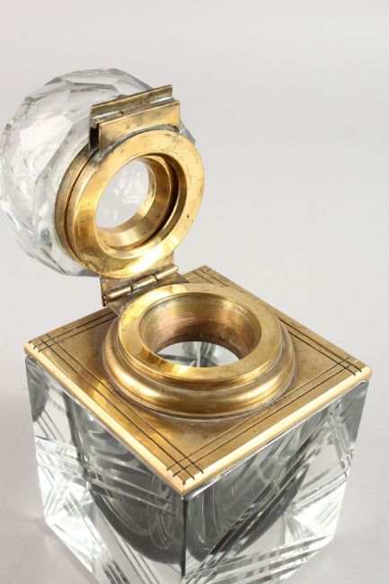 A VERY HEAVY CUT GLASS AND BRASS TABLE INKSTAND with hinged top.