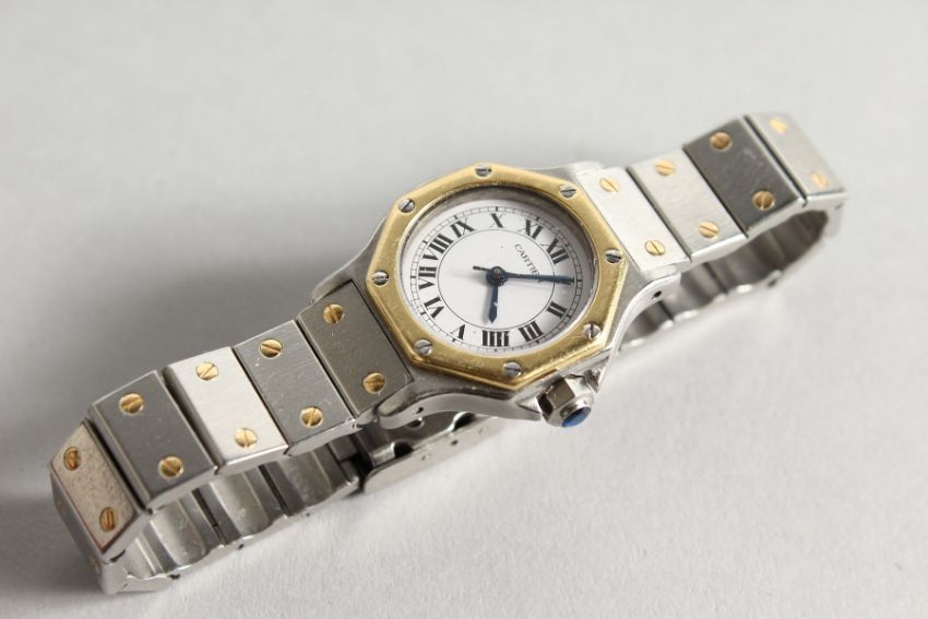 A LADIES CARTIER SILVER AND GOLD WRISTWATCH, No. 090770249, in original box.