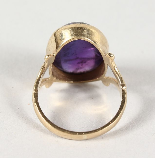 A 9CT GOLD AND LARGE AMETHYST RING.