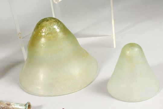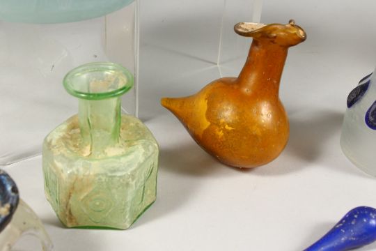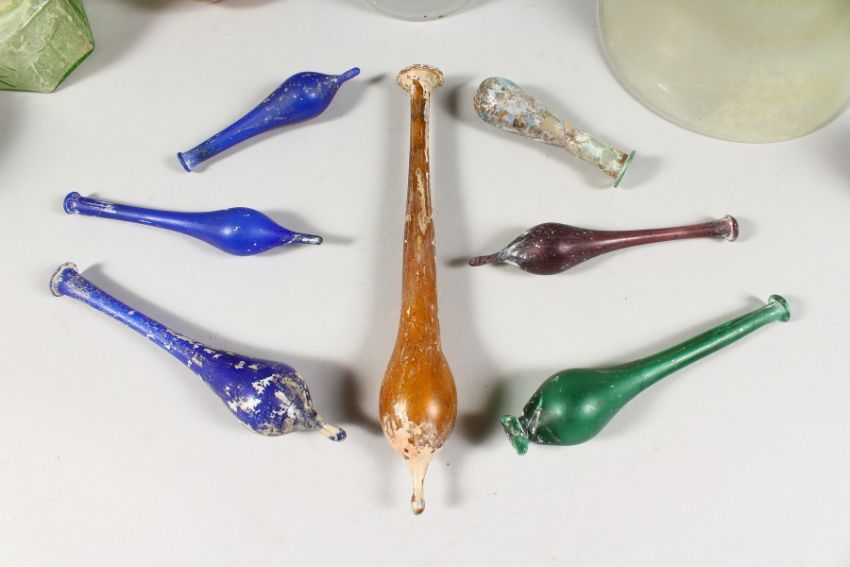 A COLLECTION OF EIGHTEEN ROMAN TYPE DECORATIVE GLASS PIECES. (one destroyed)