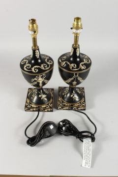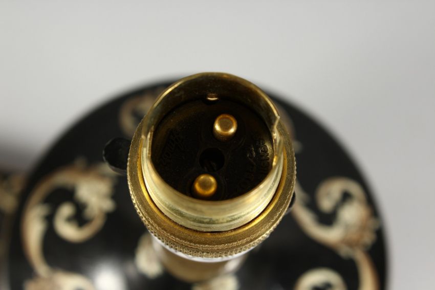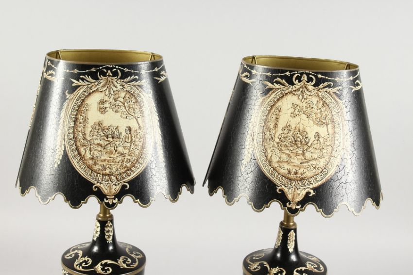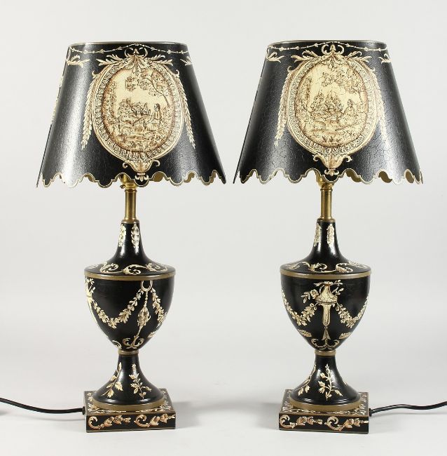 A PAIR OF TOLEWARE STYLE URN SHAPED TABLE LAMPS WITH SHADES.