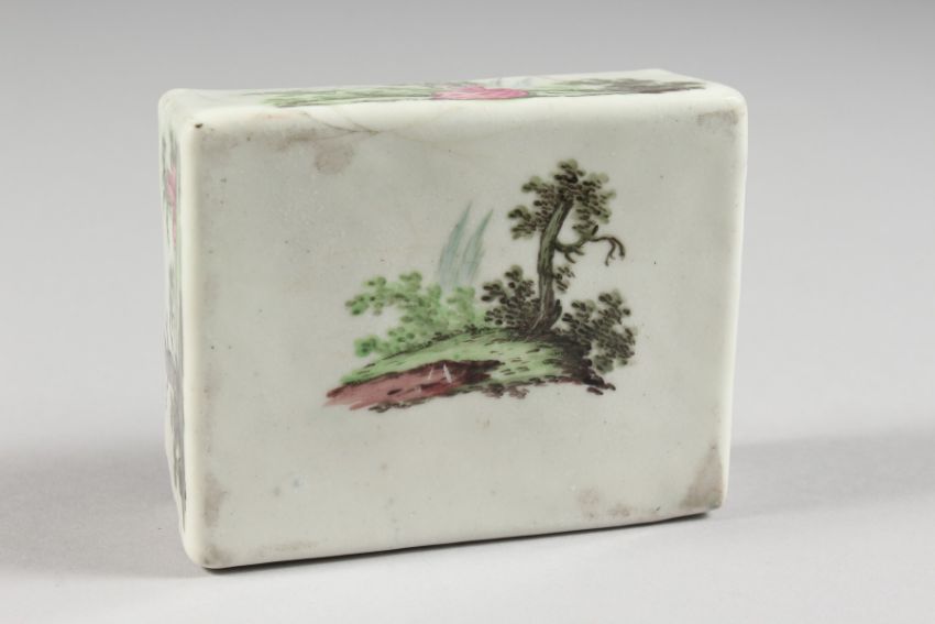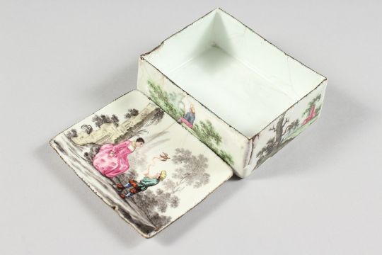 AN 18TH CENTURY ENAMEL BOX AND COVER, the top with a shepherdess and boy, the sides with rural scenes.