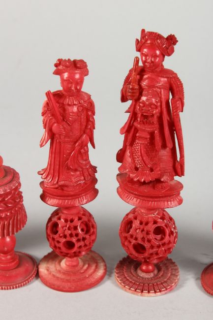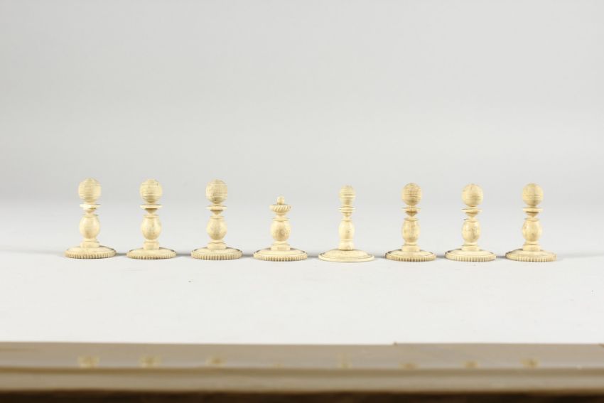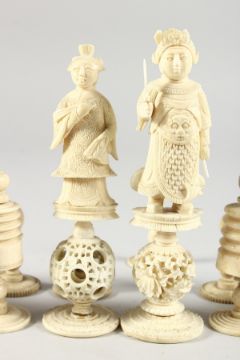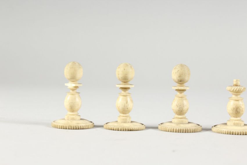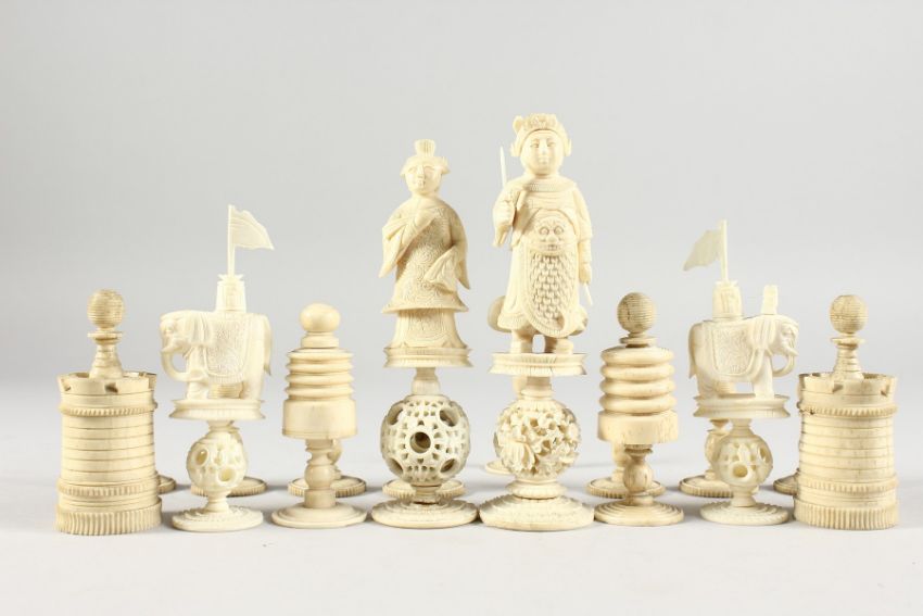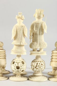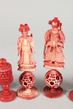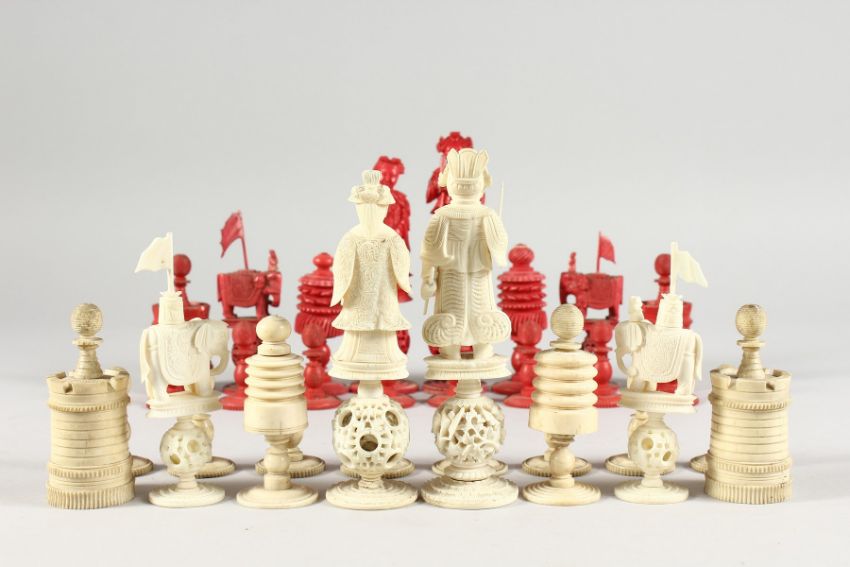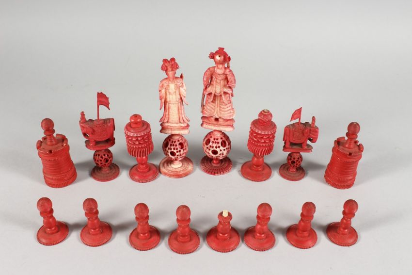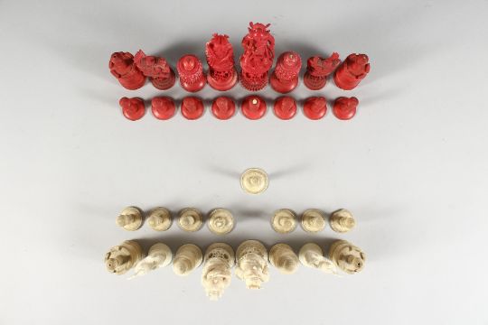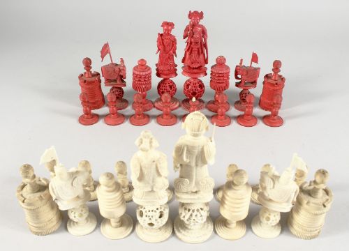 A GOOD MIXED SET OF CHINESE AND ENGLISH CARVED AND STAINED IVORY/BONE CHESS PIECES. (32)