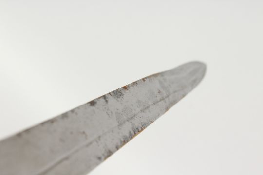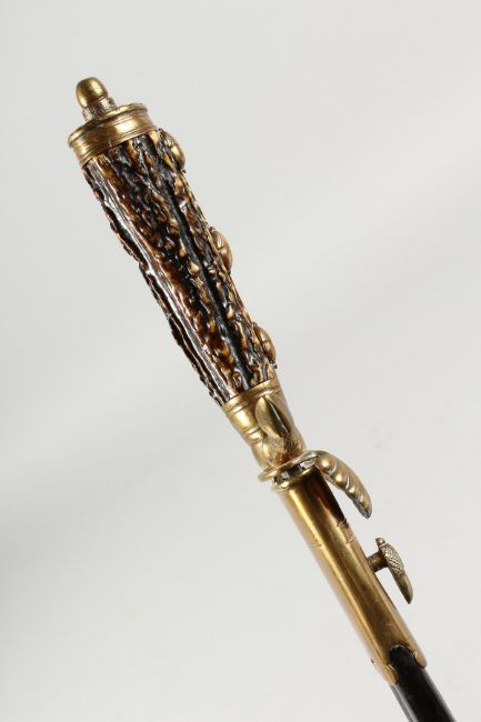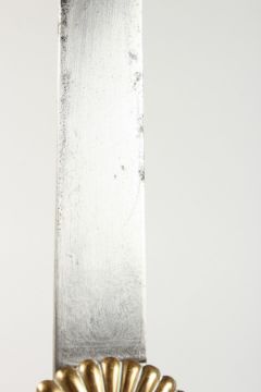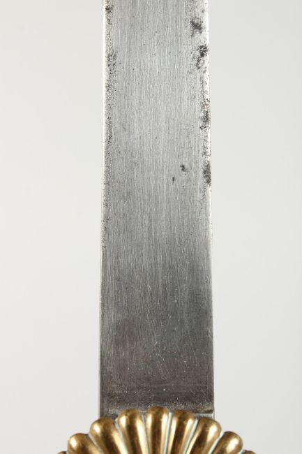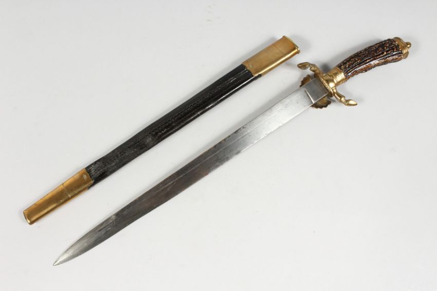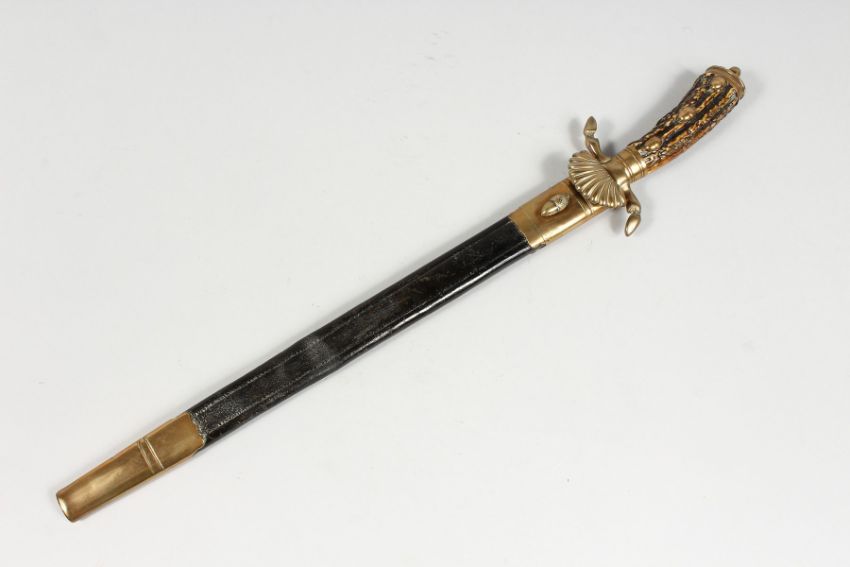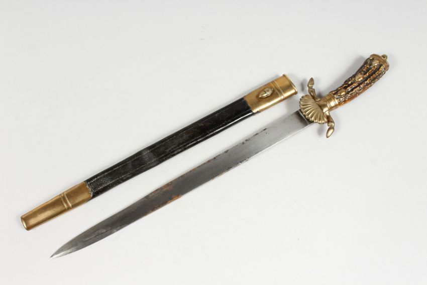 A SCOTTISH SWORD with bone and brass handle, in a leather sheath.