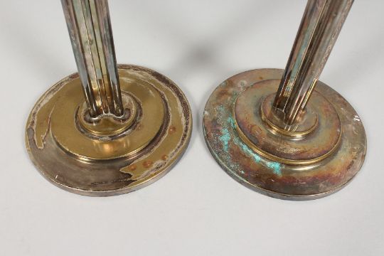 A PAIR OF ART DECO STYLE COLUMN SHAPE CANDLESTICKS on circular bases.