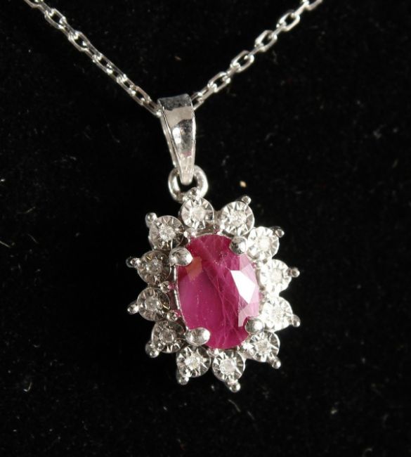 A GOOD 9CT GOLD, RUBY AND DIAMOND PENDANT ON CHAIN.