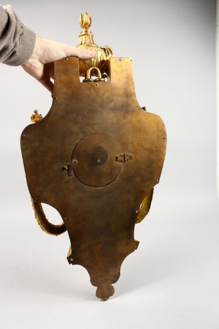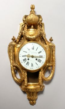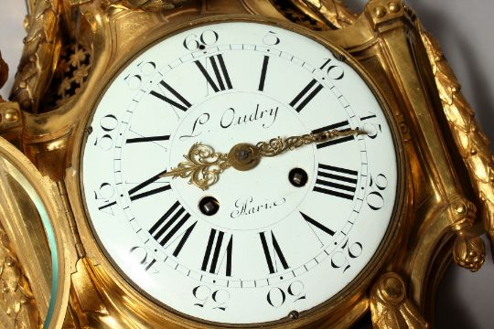 A VERY GOOD LOUIS XVI ORMOLU CARTEL CLOCK BY L. OUDRY A PARIS, 6ins black and white dial, eight day movement, in a superb case with urn, ram's mask and laurel.