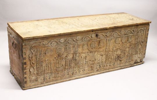 A 17TH CENTURY ITALIAN CARVED PINE CASSONE, the rising top and front carved with stylized vases of flowers, a small candle box to the interior (top possibly the front of a similar cassone).