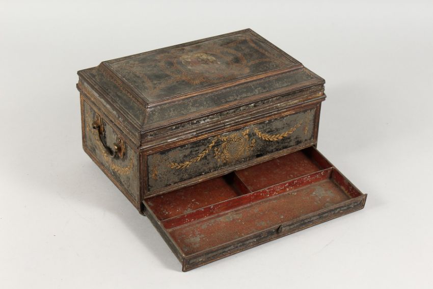 A 19TH CENTURY FRENCH TIN JEWELLERY CASKET with velvet interior.