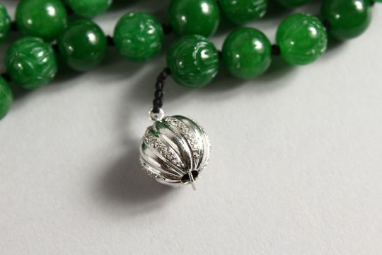A LONG JADE BEAD NECKLACE with 18ct white gold and diamond clasp.