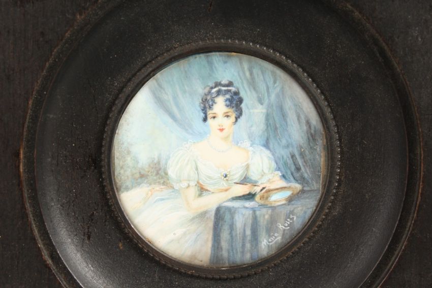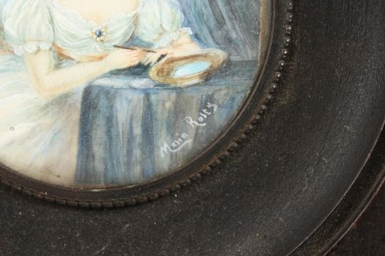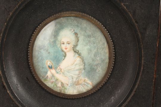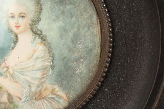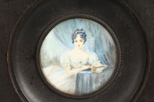 A PAIR OF CIRCULAR PORTRAIT MINIATURES OF YOUNG LADIES in wooden frames.