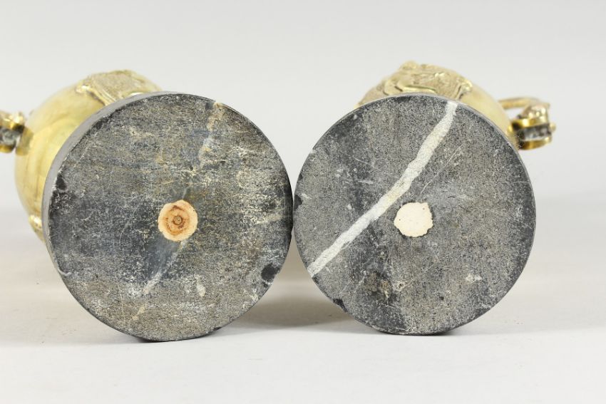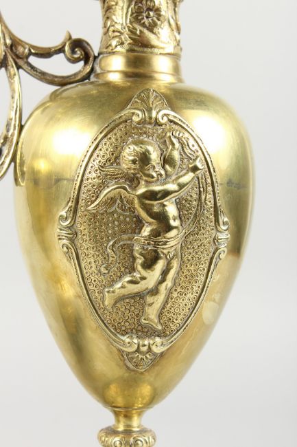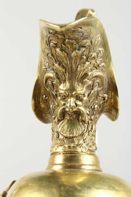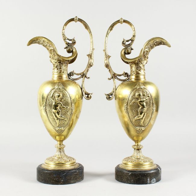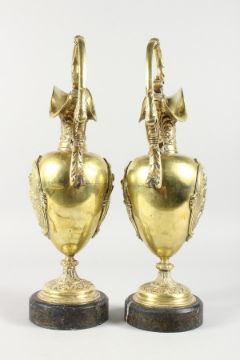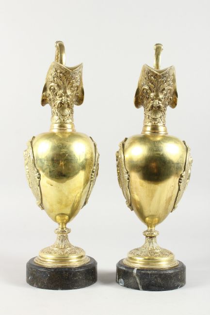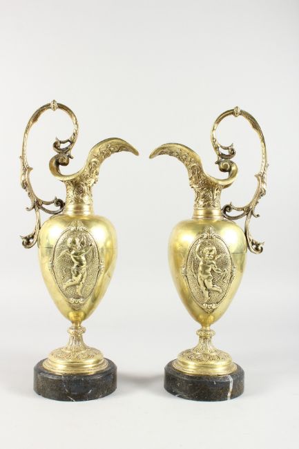 A GOOD PAIR OF 19TH CENTURY FRENCH ORMOLU EWERS, each with panels of cupids and mask spouts, on circular marble bases.