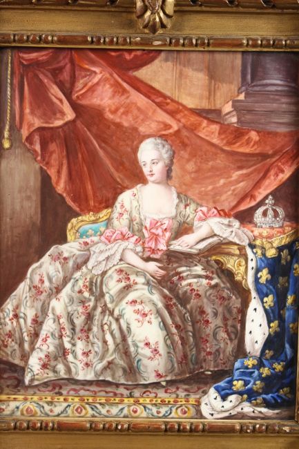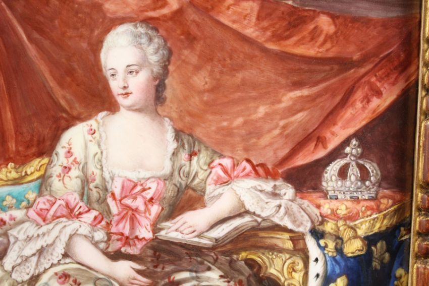 A SUPERB 18TH - 19TH CENTURY FRENCH ENAMEL PORTRAIT PLAQUE OF MARIE ANTOINETTE sitting in a chair, her crown by her side.