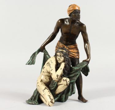 A VIENNA STYLE COLD PAINTED BRONZE OF AN ARAB MAN AND A WOMAN.