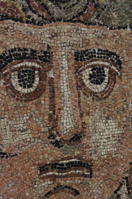 A SMALL RUSSIAN MOSAIC STONEWARE PANEL depicting a head.
