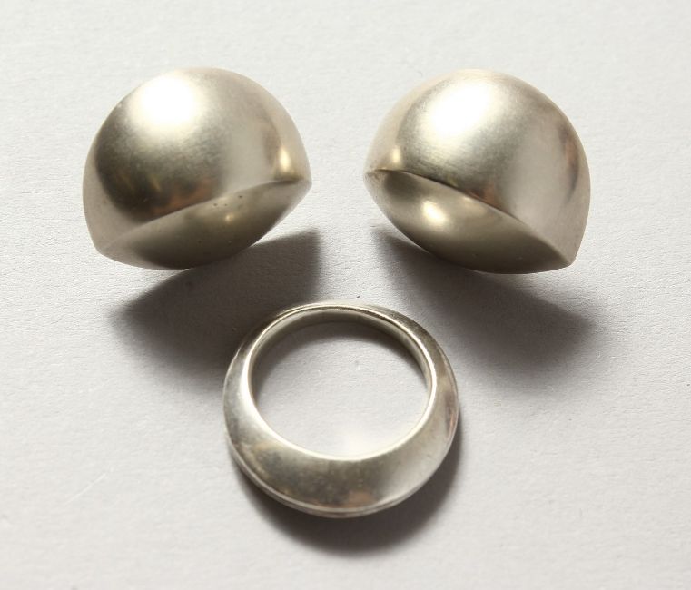 A PAIR OF SILVER EARRINGS AND RING by ULLA HORNFELDT.