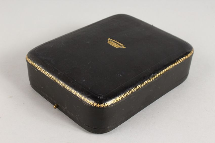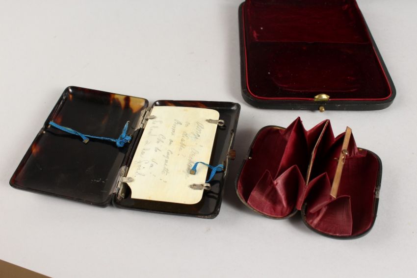 A VICTORIAN GOLD INLAID TORTOISESHELL CARD CASE and A SMALL PURSE in a leather case, E. LAJOUE, CHAMBERY, with each coronet. Case AF.