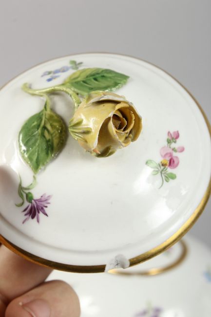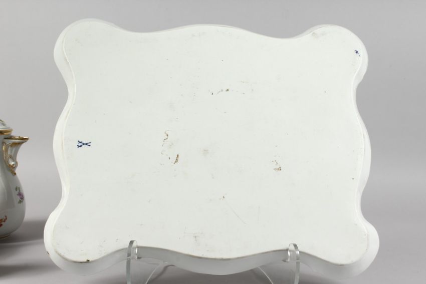 A GOOD MEISSEN PORCELAIN CABARET SET, white ground edged in gilt and sprigged with flowers, comprising tray, 18ins x 14.5ins, teapot, hot water jug, milk and cream jug.