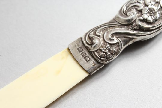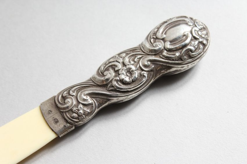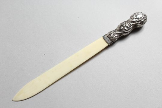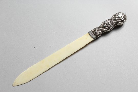 A VICTORIAN SILVER MOUNTED PAPER KNIFE.