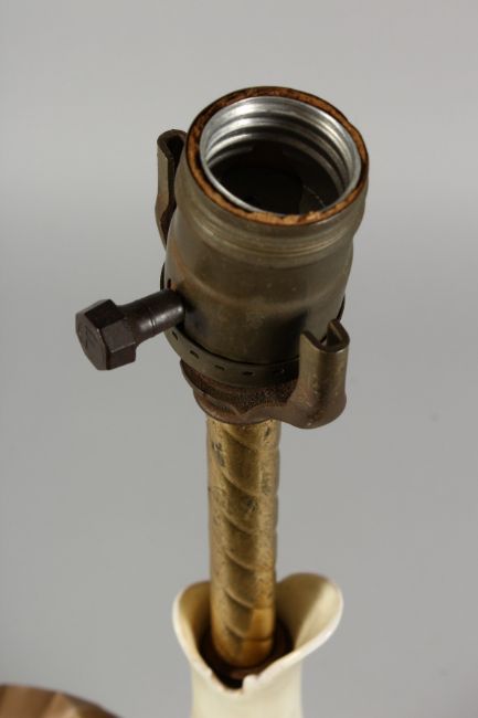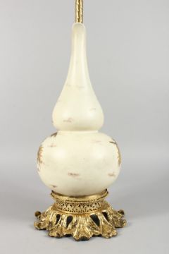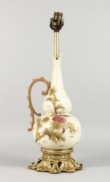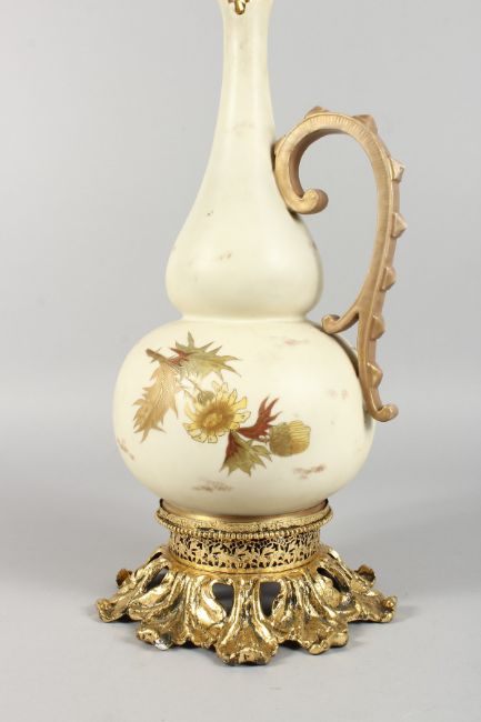 A PORCELAIN URN SHAPED JUG as a lamp, with gilt metal mounts.