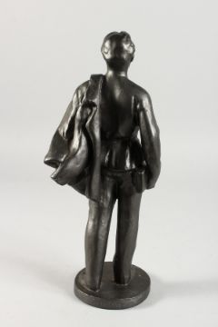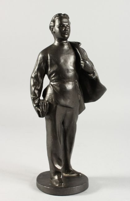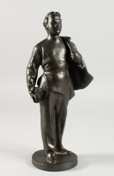 A RUSSIAN METAL STANDING FIGURE OF A MAN, a cape over his shoulders.