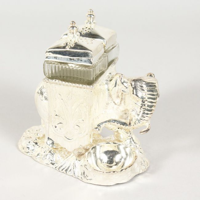 A SILVER PLATED ELEPHANT SHAPED CRUET.